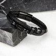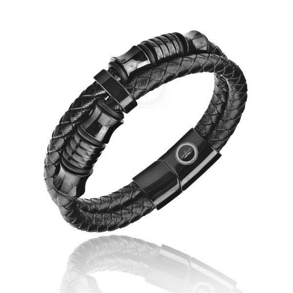 Браслет выполнен из натуральной кожи черного цвета. Аксессуар состоит из двух плетеных жгутов, на которых закреплены вставки из ювелирной стали. Магнитная застежка позволяет надежно фиксировать браслет на запястье