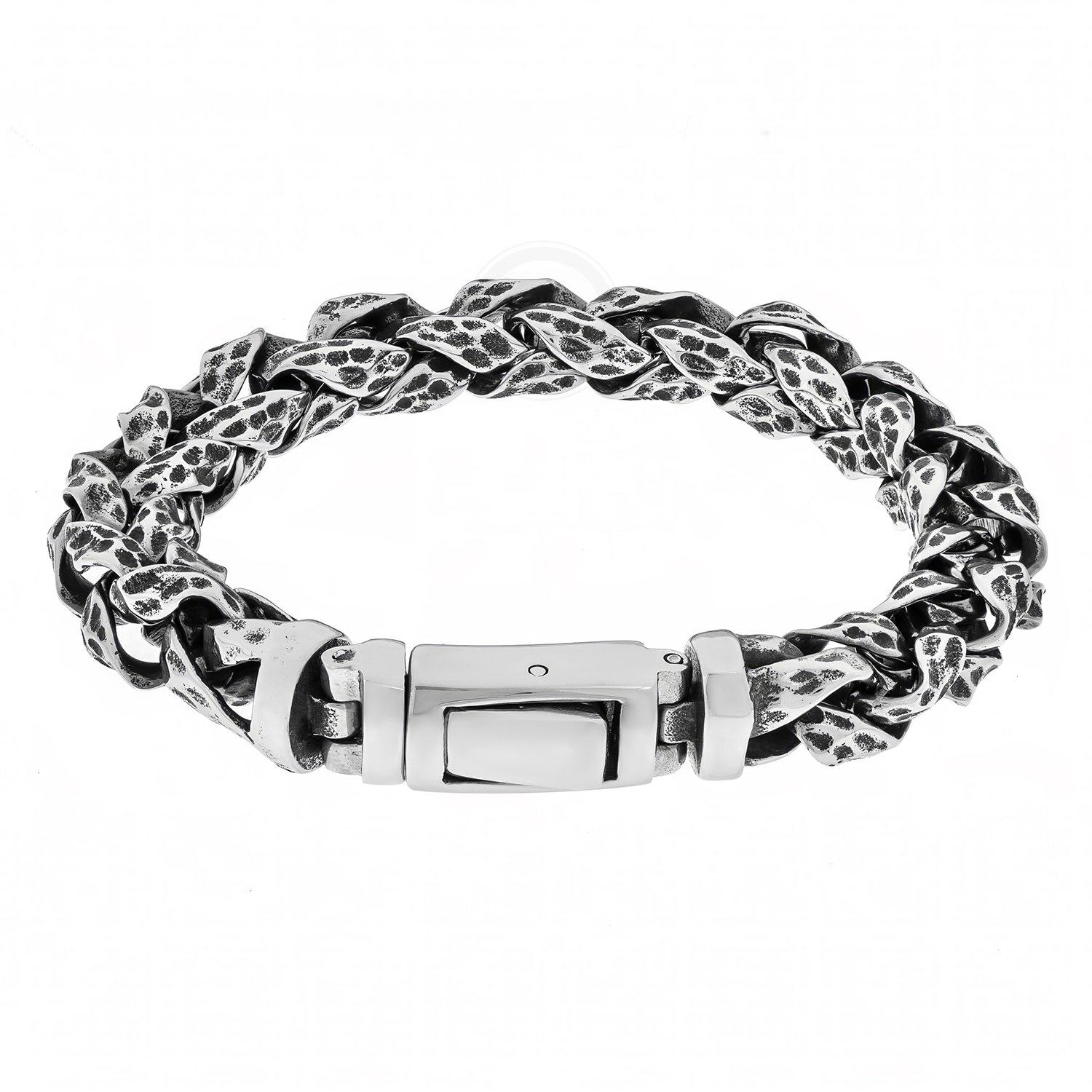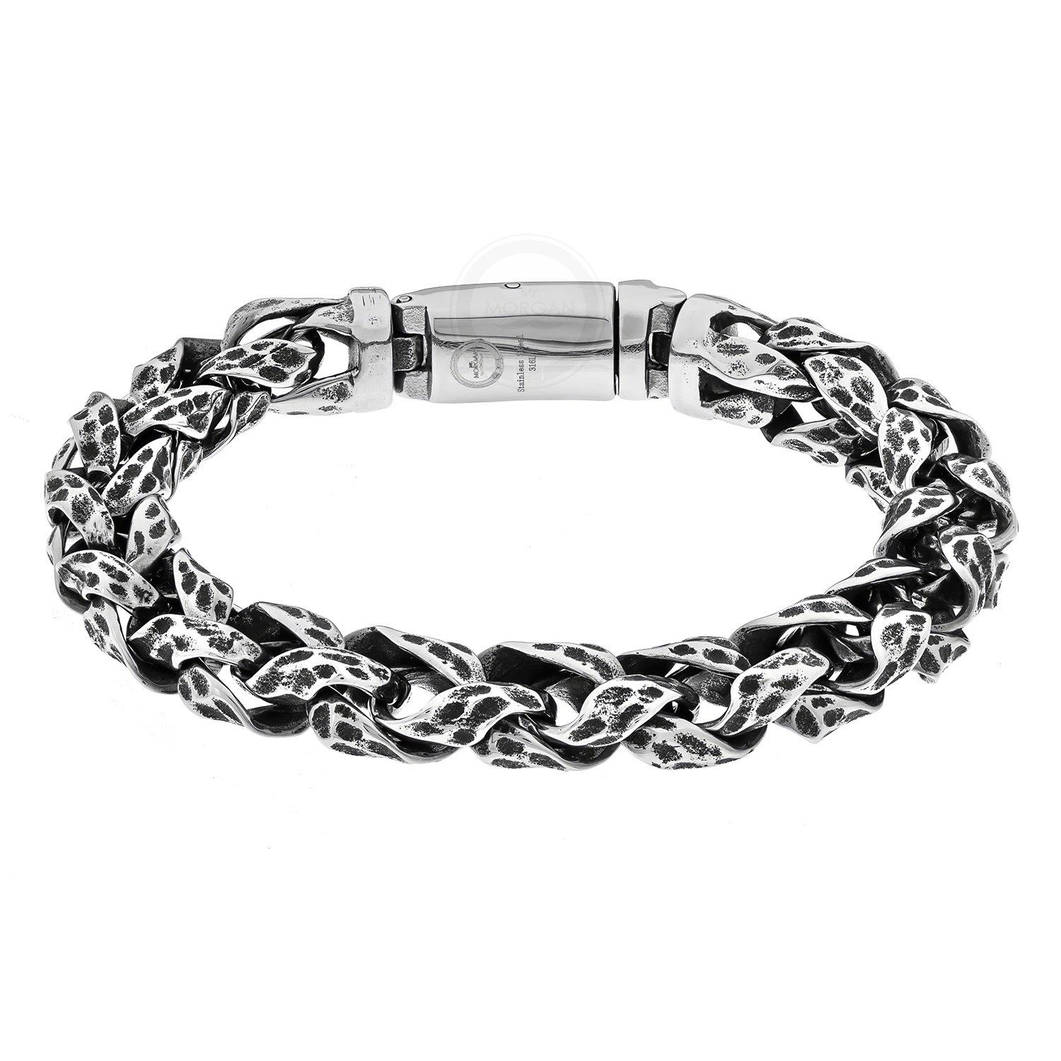 Массивный браслет из ювелирной стали, звенья которого украшены декоративной резьбой с эффектом чернения. Стильное мужское украшение, которое добавит в образ ноту брутальности