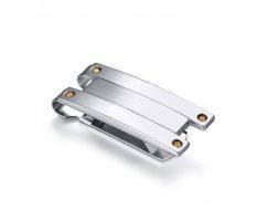 Классический зажим для денег из ювелирной стали серебристого цвета. Надежно будет удерживать Ваши купюры, занимая при этом минимум места в кармане. На гладкой глянцевой поверхности можно выполнить гравировку